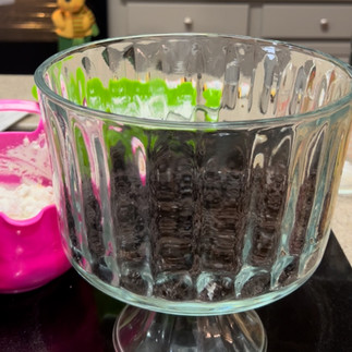 NOTE: the Oreo boxes make enough for ONE layer, not two. Traditional box cake mix make enough for two layers. You only need two total layers for a 104 oz trifle dish.